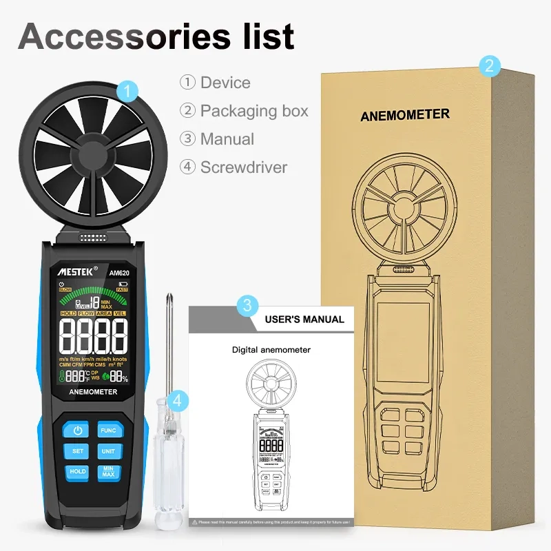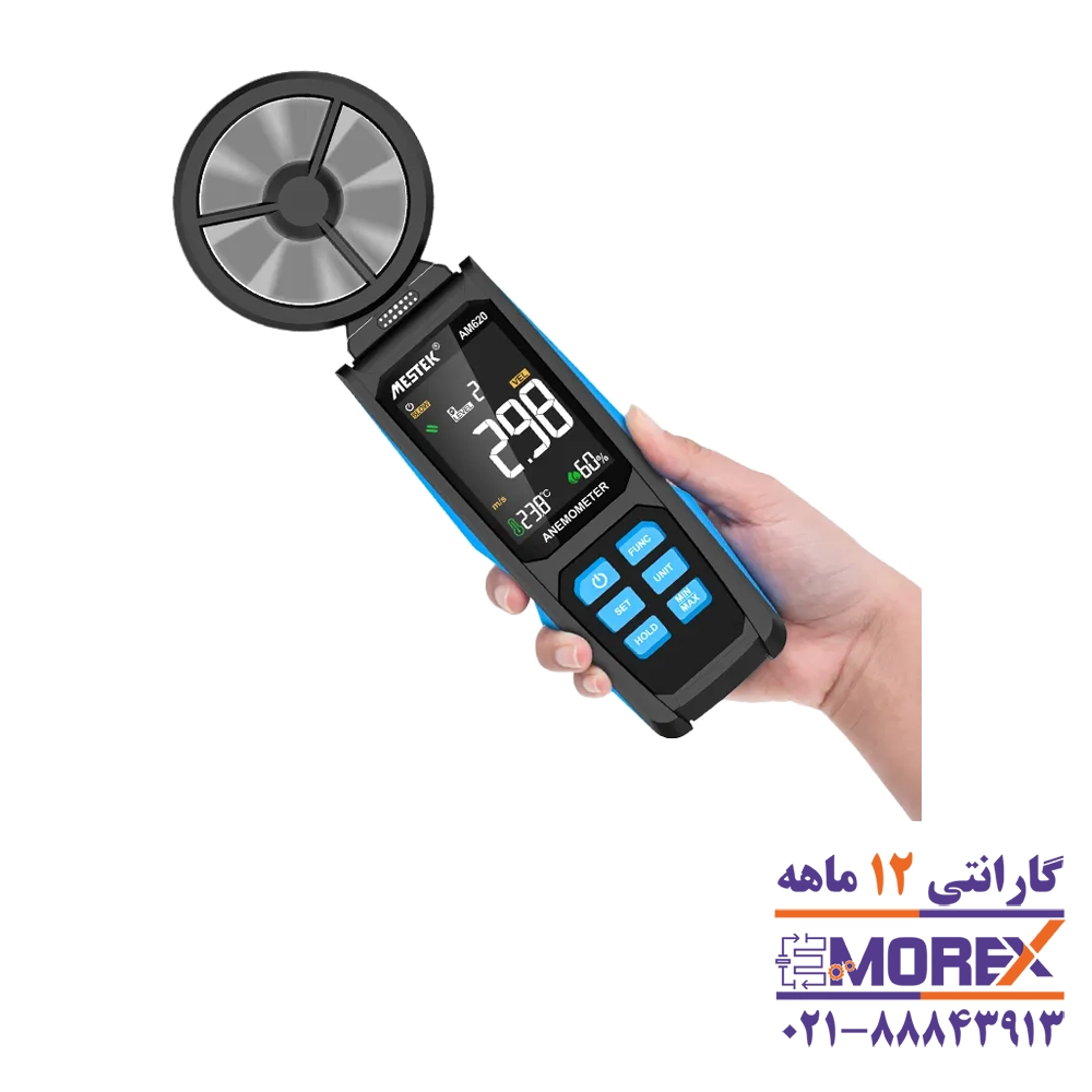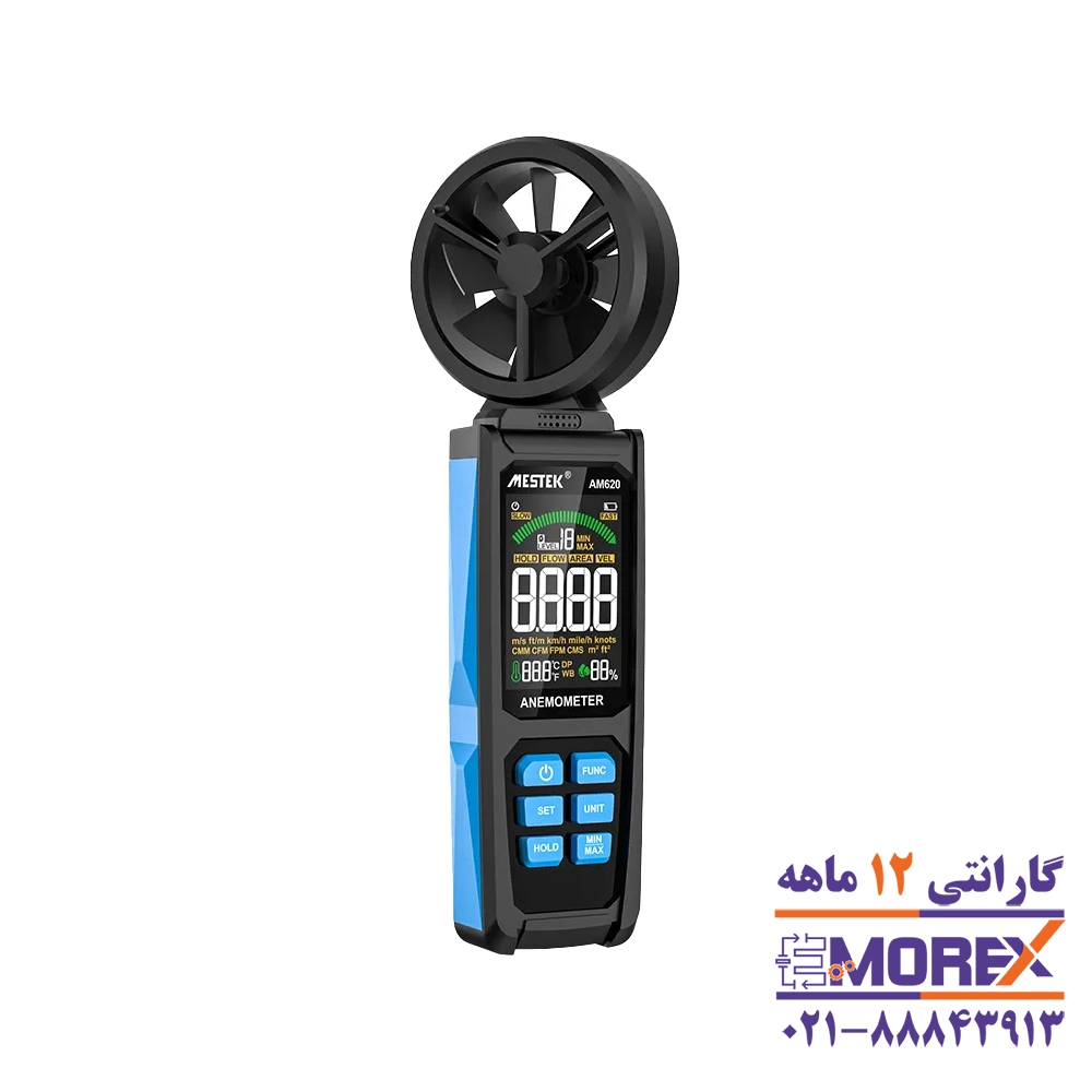 سرعت سنج باد مستک | MESTEK مدل AM620 یک آنمومتر دیجیتال پیشرفته با قابلیت اندازهگیری همزمان سرعت باد، حجم هوا، دمای محیط و رطوبت نسبی است. این دستگاه با نمایشگر رنگی بزرگ، سنسور چرخان 90 درجه و عملکرد دقیق، انتخابی کاربردی برای متخصصان HVAC، اپراتورهای پهپاد، و کاربران حوزه هواشناسی است.