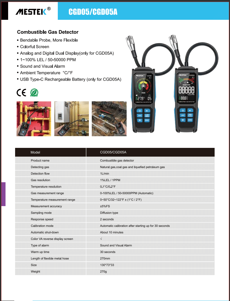 نشت یاب گاز قابل اشتعال مستک | MESTEK مدل CGD05 با طراحی پرتابل و مقاوم، امکان تشخیص سریع نشت گازهای طبیعی، مایع و زغال‌سنگ را فراهم می‌کند. این دستگاه با دقت بالا، هشدار صوتی و نوری، مناسب کاربردهای صنعتی، خانگی و محیط‌های HVAC است.