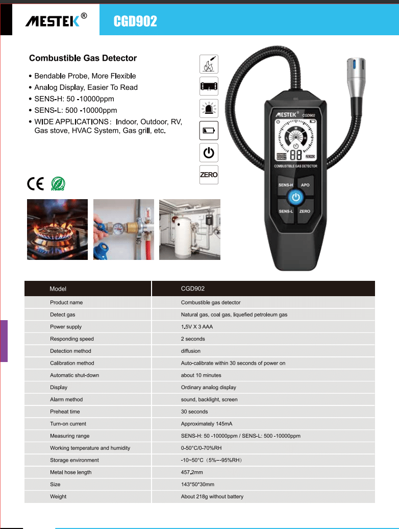 دستگاه هشدار دهنده نشت گاز مستک | MESTEK مدل CGD902 با سنسور حساس، نمایشگر آنالوگ، آلارم صوتی و هشدار تصویری (نور قرمز)، گزینهای ایدهآل برای ایمنی محیطهای مسکونی و صنعتی است. مناسب برای گازهای متان و گاز مایع نفتی.