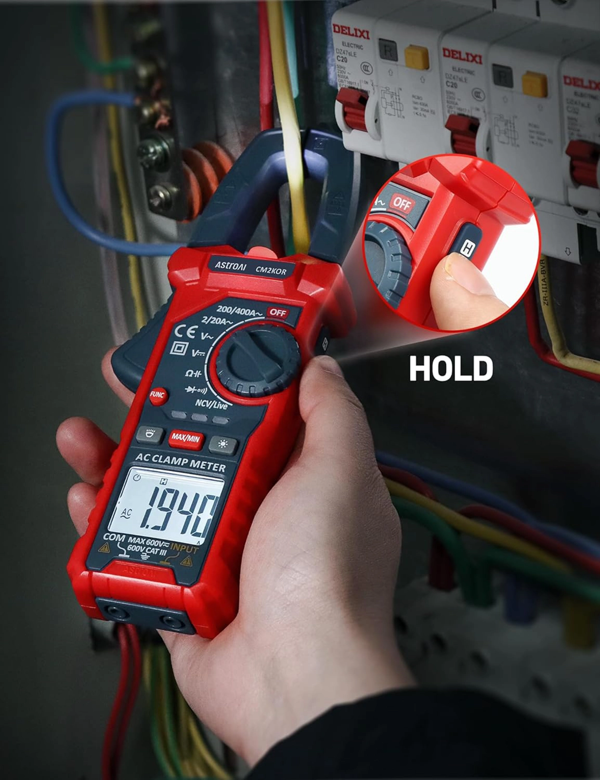 مولتی متر کلمپی دیجیتال آسترو آی | ASTROAI مدل CM2K0R ابزاری چندمنظوره برای اندازهگیری پارامترهای الکتریکی مانند ولتاژ، جریان، مقاومت و ظرفیت خازنی است. این دستگاه قابلیت اندازهگیری جریان متناوب (AC) تا 400 آمپر، ولتاژ AC/DC تا 600 ولت، مقاومت و ظرفیت خازن را داراست و از طریق گیره چنگکی جریان را بدون قطع مدار اندازهگیری میکند. همچنین دارای تست پیوستگی با هشدار صوتی، تست دیود و قابلیت تشخیص ولتاژ بدون تماس (NCV) برای ایمنی بیشتر است.