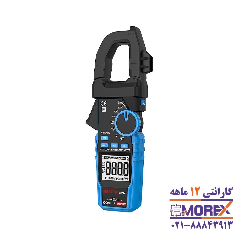 مولتی متر کلمپی دیجیتال مستک | MESTEK مدل CM87A، یک مولتیمتر دیجیتال حرفهای با قابلیت True RMS و رنج خودکار است که جریان AC تا 600 آمپر، ولتاژ، مقاومت، ظرفیت خازنی و فرکانس را با دقت بالا اندازهگیری میکند.