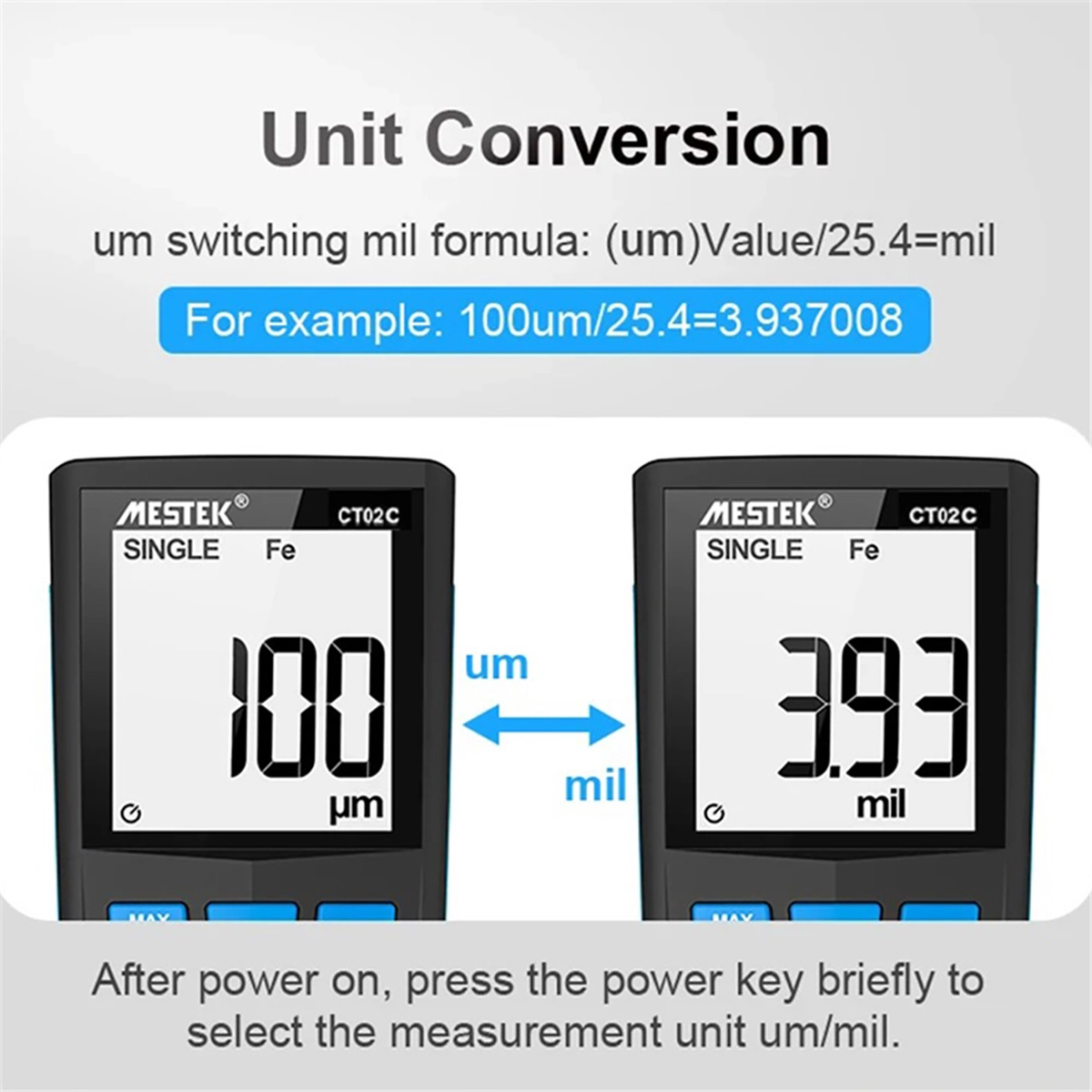ضخامت سنج رنگ دیجیتال مستک | MESTEK مدل CT02C ابزاری دقیق، کاربردی و قابلاعتماد برای سنجش ضخامت پوششهای رنگی روی انواع سطوح فلزی است. ضخامت سنج رنگ دیجیتال مستک | MESTEK مدل CT02C با بهرهگیری از صفحهنمایش دیجیتال با نور پسزمینه، خواندن اطلاعات را حتی در محیطهای کمنور آسان میکند. عملکرد خودکار خاموشی بعد از 10 دقیقه استفادهنکردن، موجب صرفهجویی در مصرف انرژی و افزایش عمر دستگاه میشود.