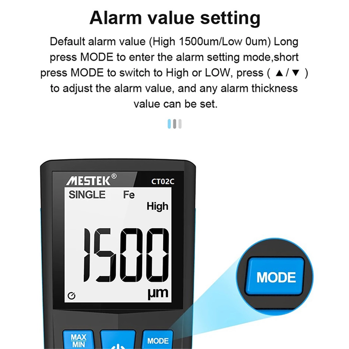 ضخامت سنج رنگ دیجیتال مستک | MESTEK مدل CT02C دستگاهی دقیق با قابلیت تشخیص خودکار نوع فلز، نمایشگر روشن، کالیبراسیون سریع و طراحی ارگونومیک است که برای سنجش پوشش رنگ روی سطوح فلزی کاربرد دارد.