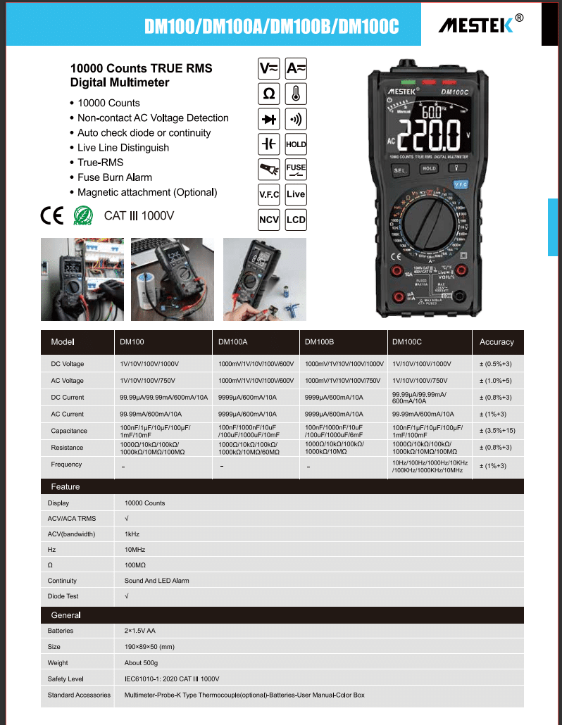 مولتی متر دیجیتال مستک | MESTEK مدل DM100A یک ابزار اندازهگیری پیشرفته و همهکاره با قابلیت تشخیص خودکار رنج، تست دیود، بیزر پیوستگی و اندازهگیری دقیق ولتاژ، جریان، مقاومت، خازن و ESR است. این دستگاه با استاندارد ایمنی CAT III 1000V طراحی شده و دارای نمایشگر با وضوح بالا و قابلیت تشخیص جریان بدون تماس (NCV) میباشد.