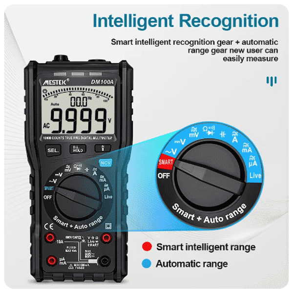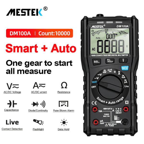 مولتی متر دیجیتال مستک | MESTEK مدل DM100A ابزاری همهکاره و پیشرفته است که بهطور ویژه برای متخصصان الکترونیک، تعمیرکاران موبایل و تکنسینهای تجهیزات صنعتی طراحی شده است. این مولتیمتر با قابلیت تشخیص خودکار Auto Range، نیازی به انتخاب دستی نوع پارامتر اندازهگیری ندارد و کار با آن را سریع، آسان و بدون خطا میسازد.