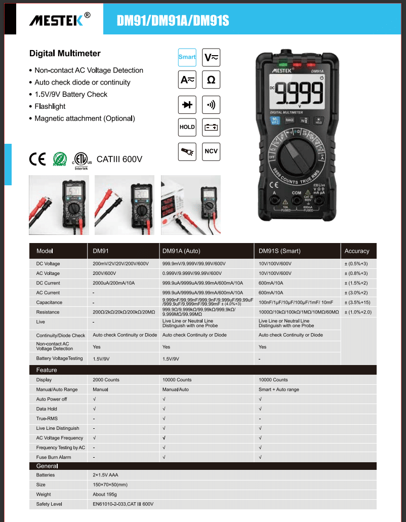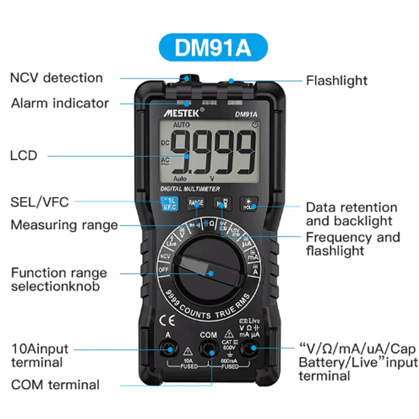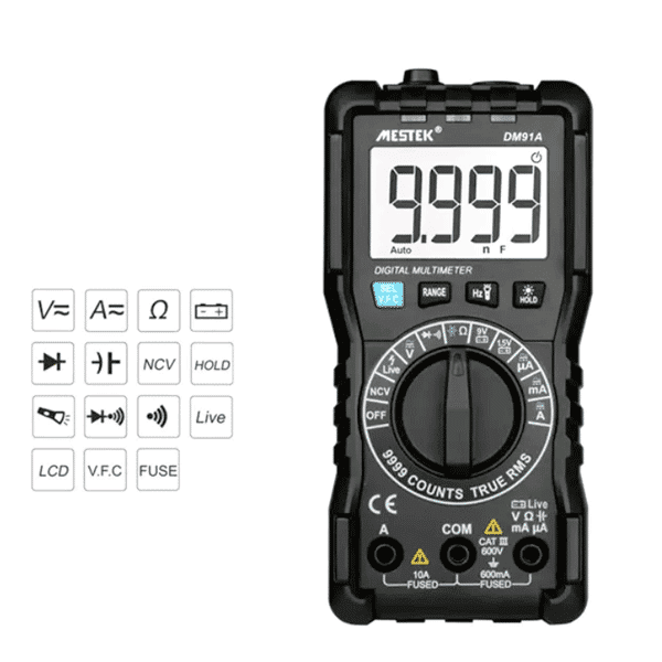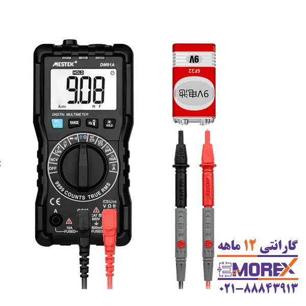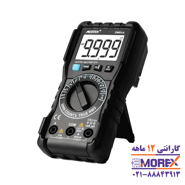 مولتی متر دیجیتالی مستک | MESTEK مدل DM91A دستگاهی مقاوم و دقیق با قابلیت اندازهگیری ولتاژ و جریان AC/DC، مقاومت، خازن، تست دیود و باتری است. این مولتیمتر دارای صفحهنمایش LCD با وضوح بالا، استانداردهای ایمنی CAT III 600V و EN61010-2-033 و محدوده اندازهگیری گسترده است که آن را مناسب برای کاربردهای صنعتی و تعمیرات الکترونیکی میسازد.