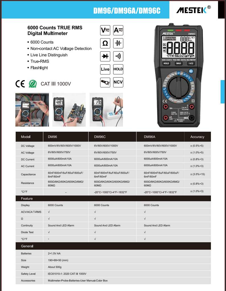 مولتی متر دیجیتالی مستک | MESTEK مدل DM96A یک ابزار اندازه‌گیری حرفه‌ای و کاربردی برای کاربران صنعتی، خودرویی و حتی مصارف خانگی است. این دستگاه با سرعت نمونه‌برداری 3 ثانیه‌ای و شمارش 6000 عددی، امکان اندازه‌گیری دقیق جریان و ولتاژ AC/DC، مقاومت، ظرفیت خازن، دما، دیود و تست پیوستگی (ON-OFF) را فراهم می‌سازد.