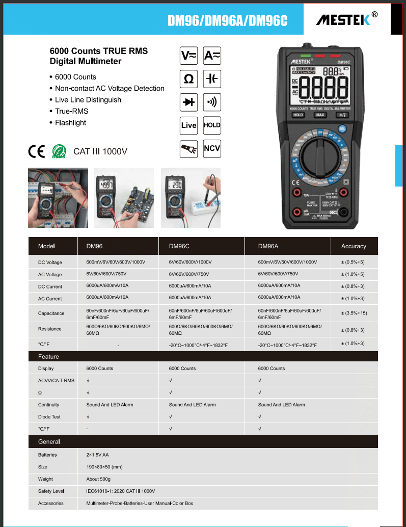 ویژگی‌های کلیدی مولتی متر دیجیتالی مستک مدل DM96C: