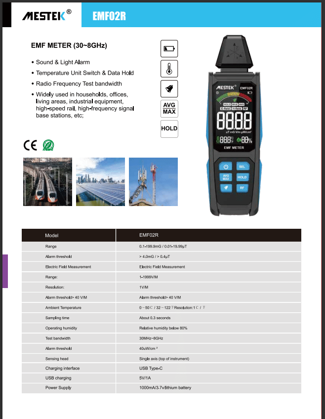 تشعشع سنج یا پرتوسنج الکترومغناطیسی مستک مدل EMF02R یک دستگاه حرفه‌ای و دقیق برای اندازه‌گیری تابش‌ (اشعه) های الکترومغناطیسی و تشخیص اختلالات الکترومغناطیسی ناشی از مواد مختلف در محیط‌های صنعتی و خانگی است. این تستر با سنسور داخلی پیشرفته و کنترل ریزتراشه‌ای، داده‌های اندازه‌گیری را به صورت شفاف و دقیق روی نمایشگر LCD رنگی نمایش می‌دهد.