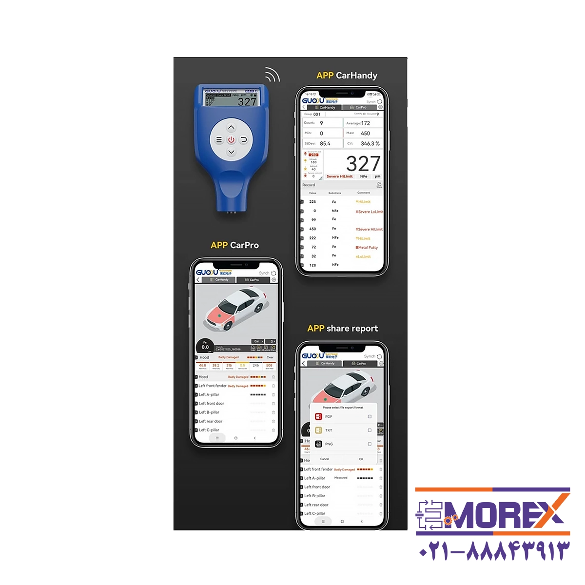 ضخامت سنج رنگ گواو | GUOOU مدل GC8102، ابزاری حرفه‌ای برای اندازه‌گیری ضخامت رنگ و تشخیص رنگ‌شدگی، بتونه و آسیب‌های بدنه خودرو است. این دستگاه با دقت بالا، نمایشگر LCD و قابلیت اتصال به گوشی موبایل از طریق بلوتوث، انتخابی مناسب برای کارشناسان خودرو می‌باشد.
