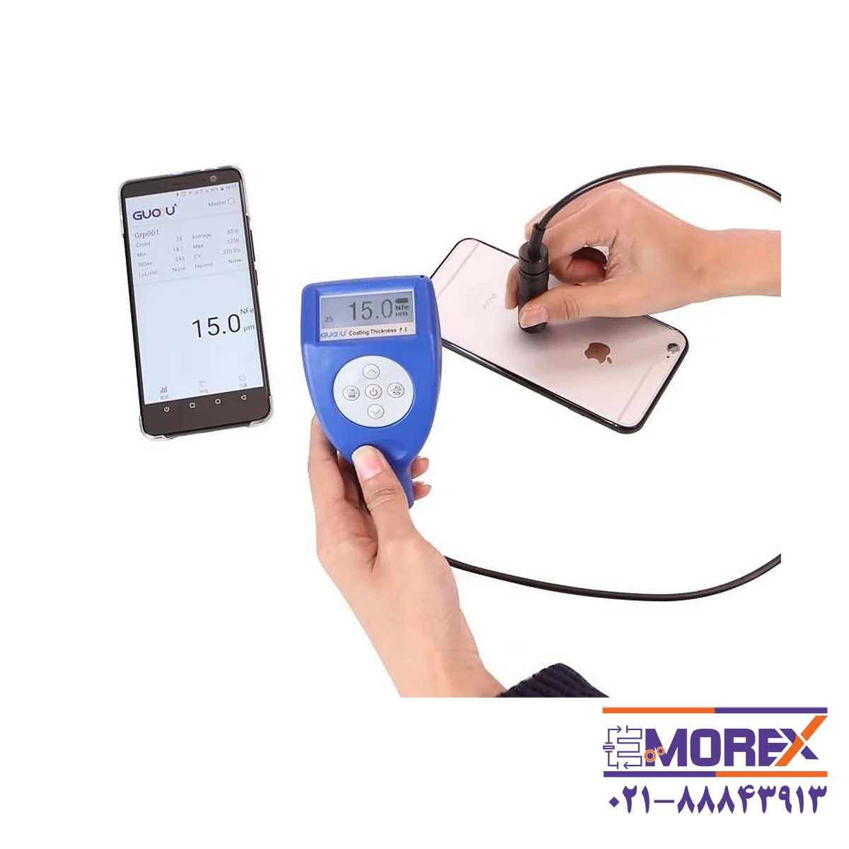 این ضخامت سنج از طریق اپلیکیشن GUOOU به موبایل متصل می‌شود و امکان ذخیره داده‌ها و تهیه گزارش PDF را فراهم می‌کند. منبع تغذیه دستگاه دو باتری AA یا اتصال USB 5V است و با سیستم کالیبراسیون یک‌نقطه‌ای و دو‌نقطه‌ای عملکرد دقیق خود را تضمین می‌کند.