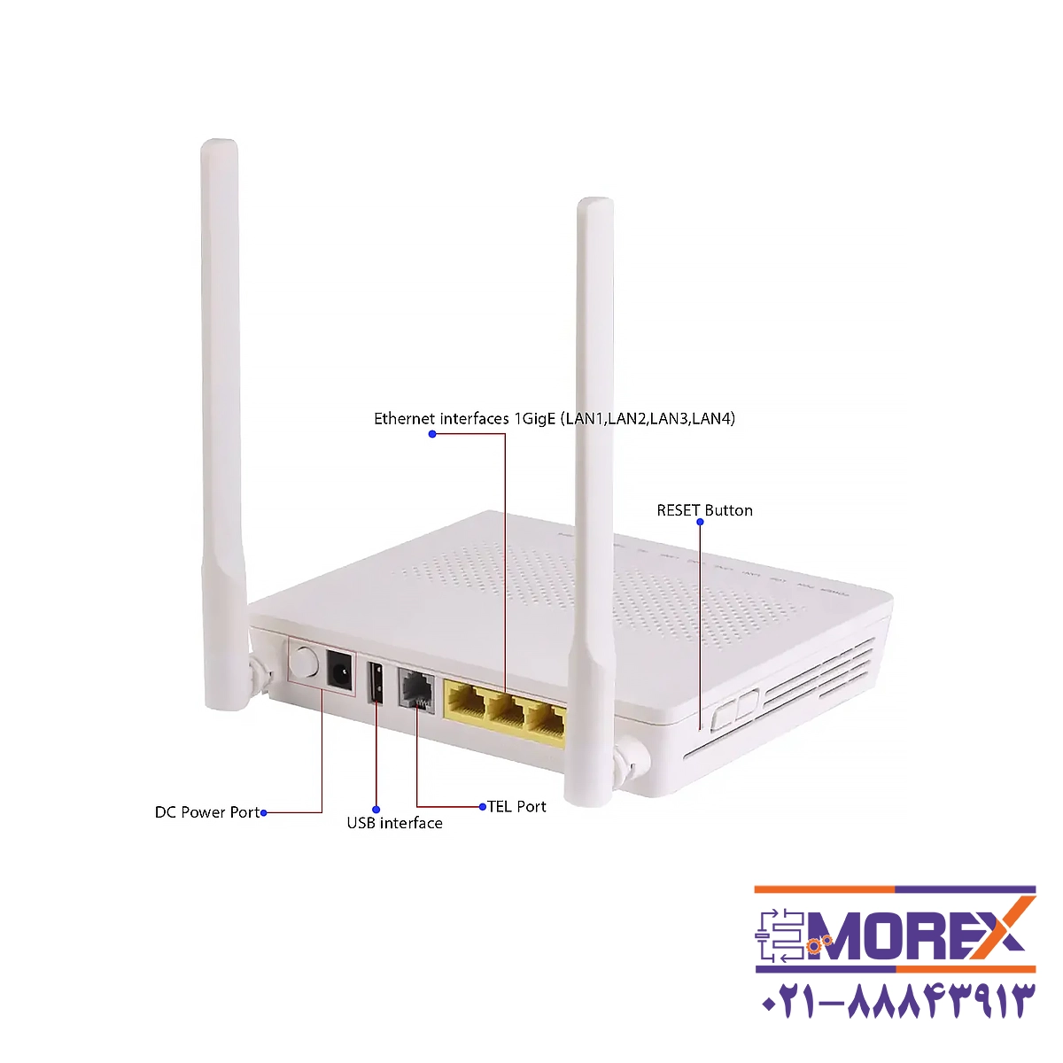 کلید POWER و نشانگرهای LED شامل POWER، PON، LOS، LAN1 تا LAN4، TEL، USB، WIFI و WPS امکان بررسی سریع وضعیت عملکرد دستگاه را فراهم میکنند.