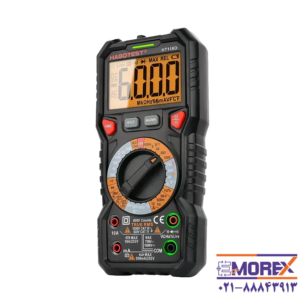 مولتی متر دیجیتال هابوتست | HABOTEST مدل HT118D یک دستگاه دستی پیشرفته با قابلیت True RMS است که اندازهگیری ولتاژ تا 1000V و جریان تا 10A را پشتیبانی میکند. این مولتی متر دارای شمارش 6000، قابلیت NCV، نور پسزمینه دو رنگ، تست دیود، تست پیوستگی و امکاناتی مانند Max/Min، Data Hold و خاموشی خودکار بوده و برای محیطهای صنعتی و آزمایشگاهی طراحی شده است.