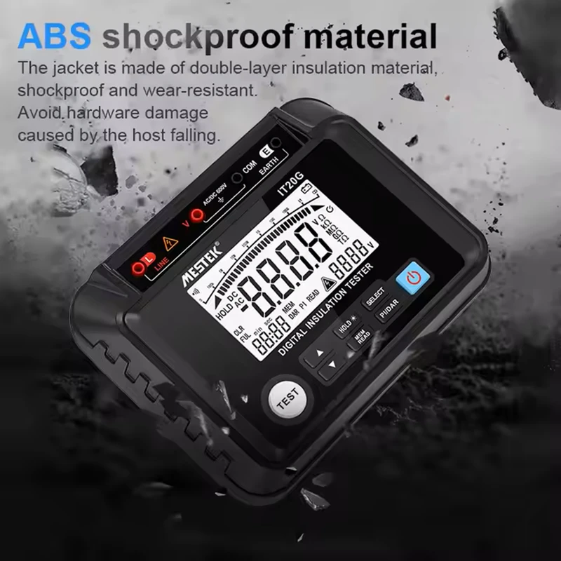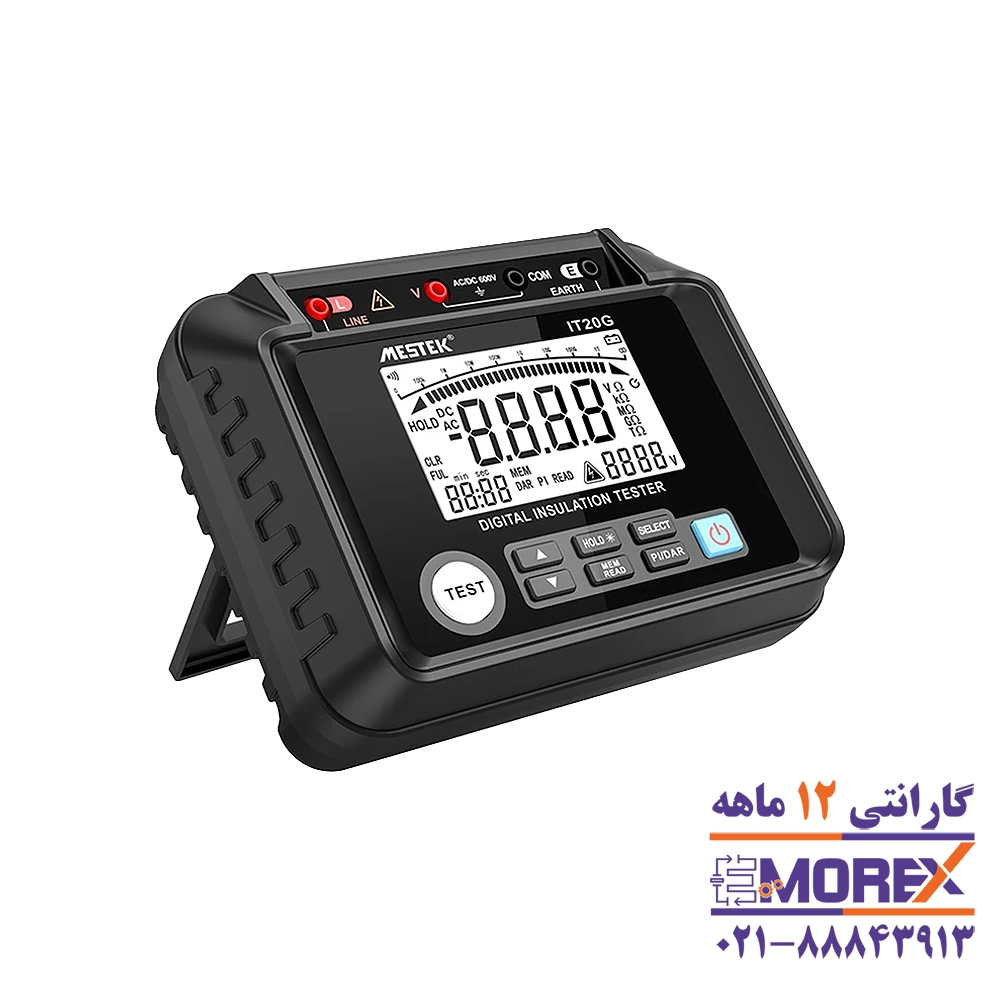 میگر (تستر مقاومت عایق) مستک | MESTEK مدل IT20G، یک تستر حرفهای مقاومت عایق با ولتاژ تست قابل انتخاب بین 250V تا 2500V است که اندازهگیری دقیق مقاومت عایق تا 20 گیگااهم را فراهم میکند. این دستگاه برای تستهای ایمنی در سیستمهای برق صنعتی و آزمایشگاهها طراحی شده و دارای نمایشگر دیجیتال بزرگ، قابلیت ذخیره داده و نور پسزمینه است.