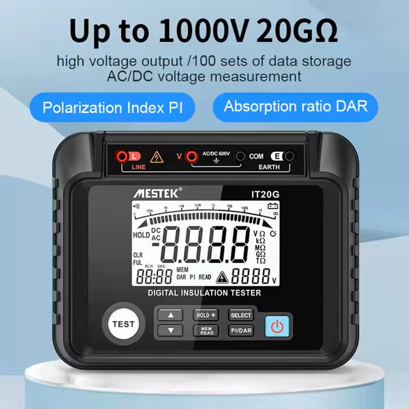 میگر (تستر مقاومت عایق) مستک | MESTEK مدل IT20G، یک ابزار پیشرفته برای بررسی سلامت عایق در تجهیزات الکتریکی است که در صنایع برق، تعمیر و نگهداری و آزمایشگاهها کاربرد دارد. این دستگاه قادر است مقاومت عایق را در بازه وسیع 0.1MΩ تا 20GΩ اندازهگیری کند و از ولتاژ تست قابل انتخاب بین 250V، 500V، 1000V و 2500V پشتیبانی میکند.