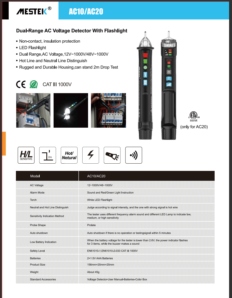تستر ولتاژ مستک | MESTEK مدل AC10 ابزاری دقیق و قابل‌اعتماد برای تشخیص سریع ولتاژ AC است. این دستگاه بدون تماس مستقیم با برق کار می‌کند و از دو محدوده ولتاژ 12-1000V و 48-1000V پشتیبانی می‌کند. با تنظیم حساسیت، آلارم صوتی و نوری و چراغ قوه LED، تستر AC10 برای استفاده در محیط‌های مختلف بسیار کاربردی است.