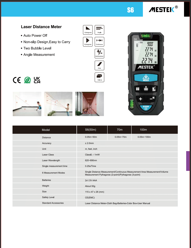 متر لیزری دیجیتال مستک | MESTEK مدل S6 70M یک ابزار پیشرفته و کارآمد است که بهطور ویژه برای اندازهگیری دقیق در فواصل مختلف طراحی شده و با قابلیت محاسبه زاویه خودکار، دقت بالایی را در انجام اندازهگیریها در زوایای مختلف فراهم میکند؛ بهطوریکه این ویژگی بهویژه برای کاربرانی که به دقت بالا و زمانبندی سریع در اندازهگیریها نیاز دارند، بسیار مفید واقع میشود. علاوه بر این، سرعت اندازهگیری 0.25 ثانیهای این متر لیزری امکان انجام اندازهگیریهای فوری را فراهم میآورد؛ بهویژه زمانی که به انجام کارهای متعدد و سریع در پروژههای مختلف نیاز دارید، این ویژگی کارآمد بهشدت به شما کمک خواهد کرد.