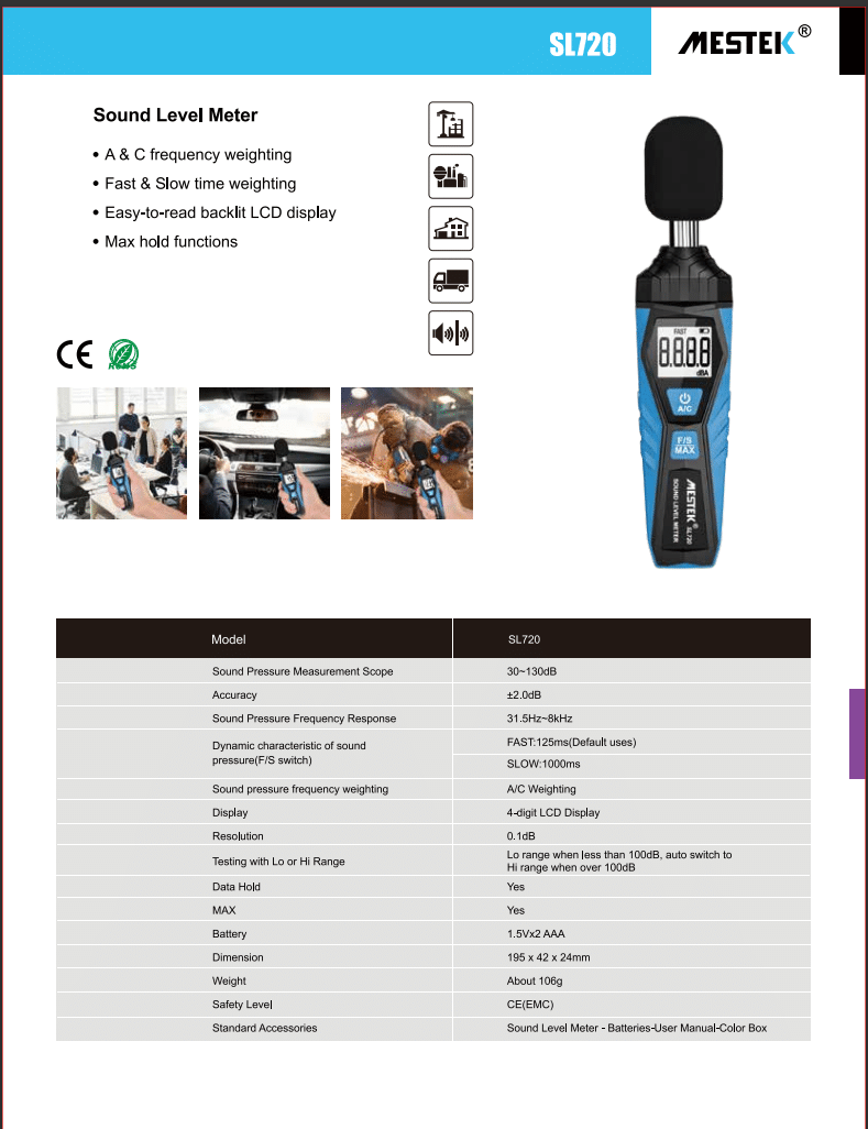 صوت سنج دیجیتالی مستک | MESTEK مدل SL720 یک دستگاه حرفهای و دقیق برای اندازهگیری شدت صدا در محیطهای مختلف است. این صوتسنج به یک سنسور میکروفون خازنی با کیفیت و تراشه پردازشگر دقیق مجهز شده است که نویز صوتی را به سیگنال الکتریکی تبدیل کرده و پس از پردازش، آن را با دقت بالا روی صفحهنمایش LCD نمایش میدهد.