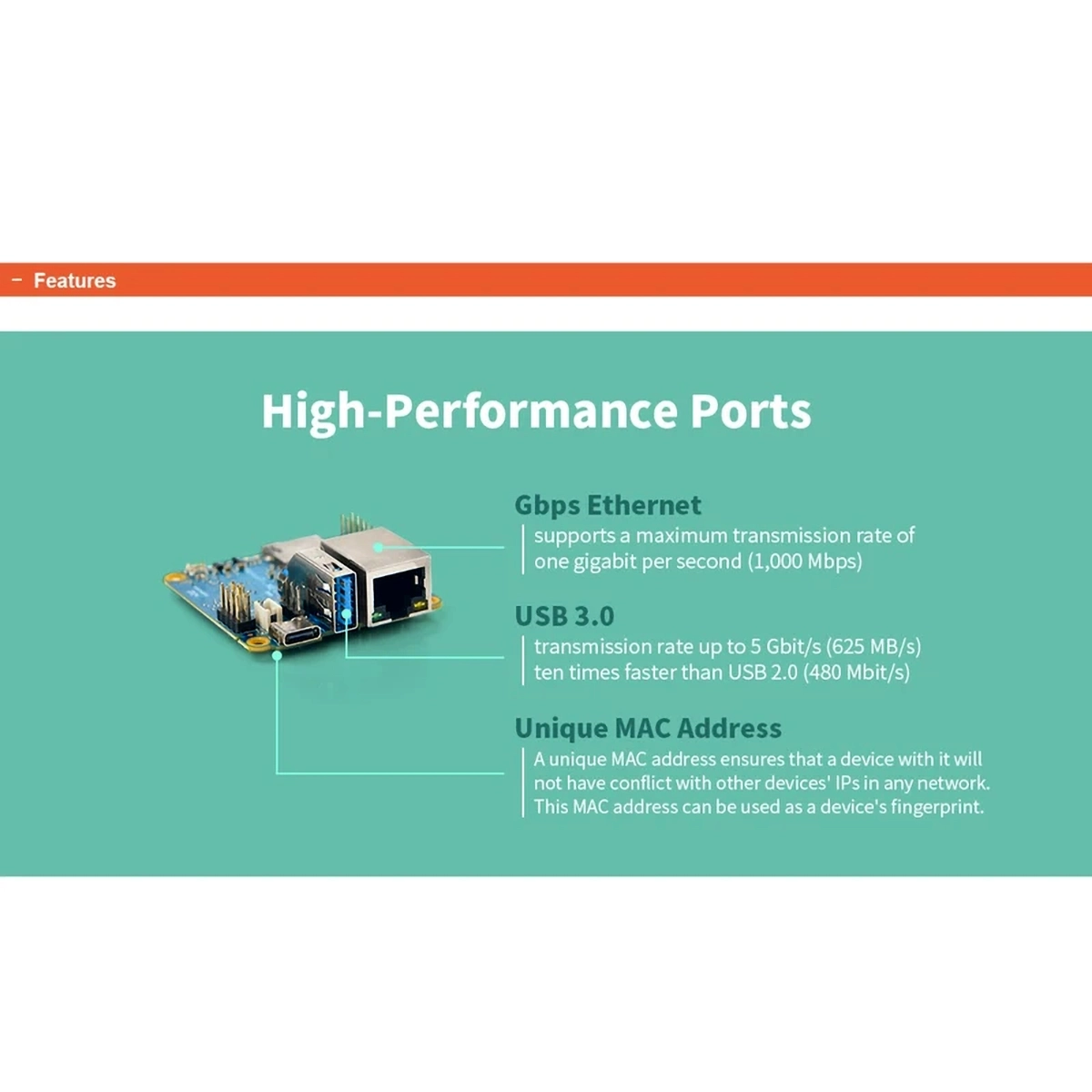 برد NEO3 1G از رابطهای متنوعی شامل USB 3.0، USB Type-C و RJ-45 LAN گیگابیتی با مک آدرس اختصاصی پشتیبانی میکند. منبع تغذیه این برد 5V/1A است که از طریق Type-C یا پینهای GPIO قابل تامین میباشد.
