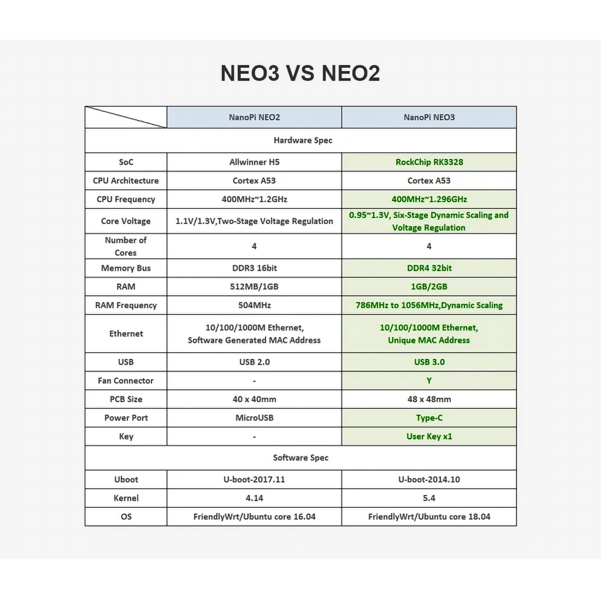 برد NEO3 2G از رابطهای متنوعی شامل USB 3.0، USB Type-C و RJ-45 LAN گیگابیتی با مک آدرس اختصاصی پشتیبانی میکند. منبع تغذیه این برد 5V/1A است که از طریق Type-C یا پینهای GPIO قابل تامین میباشد.