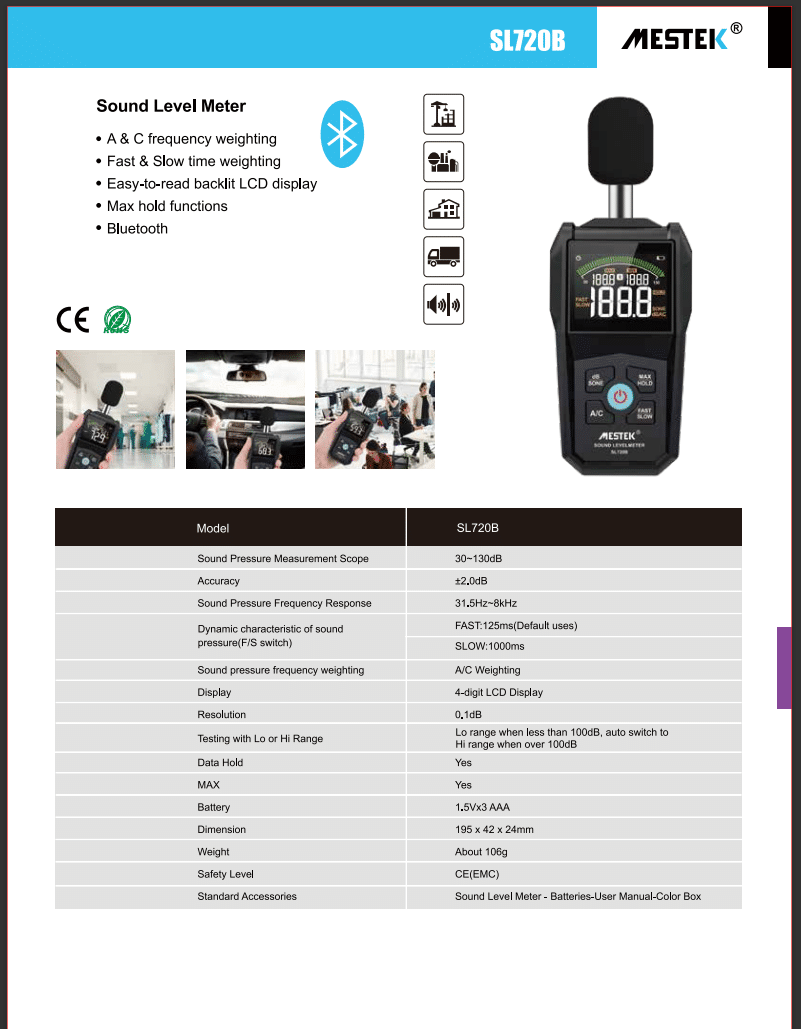 صوت سنج دیجیتالی مستک | MESTEK مدل SL720B ابزاری دقیق و کاربردی برای اندازهگیری سطح صدا در محیطهای مختلف است. این دستگاه به گونهای طراحی شده که بتواند سطوح نویز از 30 تا 130 دسیبل را با دقت بالا اندازهگیری کند و در صنایع گوناگون مورد استفاده قرار گیرد.