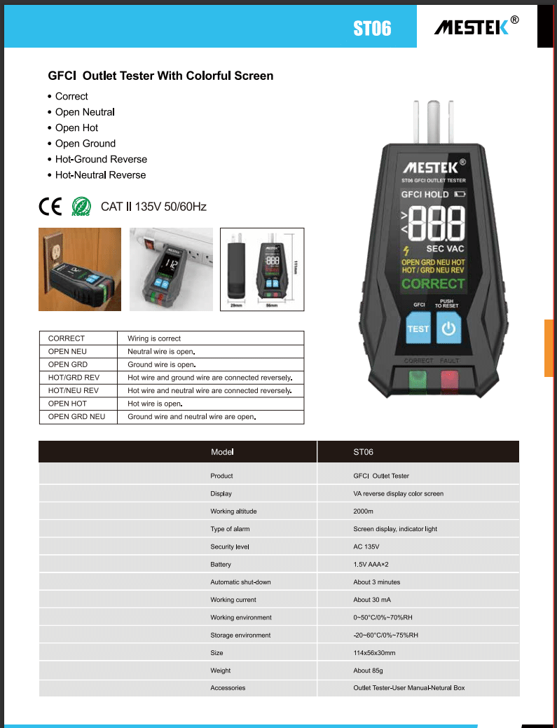 ارت سنج و تستر سوکت هوشمند مستک | MESTEK مدل ST06 با قابلیت اندازهگیری مقاومت زمین، تست سوکتهای برق و شناسایی ایرادات سیمکشی، ابزاری ضروری برای تکنسینها و مهندسان برق است. این دستگاه دارای صفحه نمایش LCD خوانا، طراحی سبک و کاربرپسند بوده و ایمنی سیستمهای الکتریکی را تضمین میکند.
