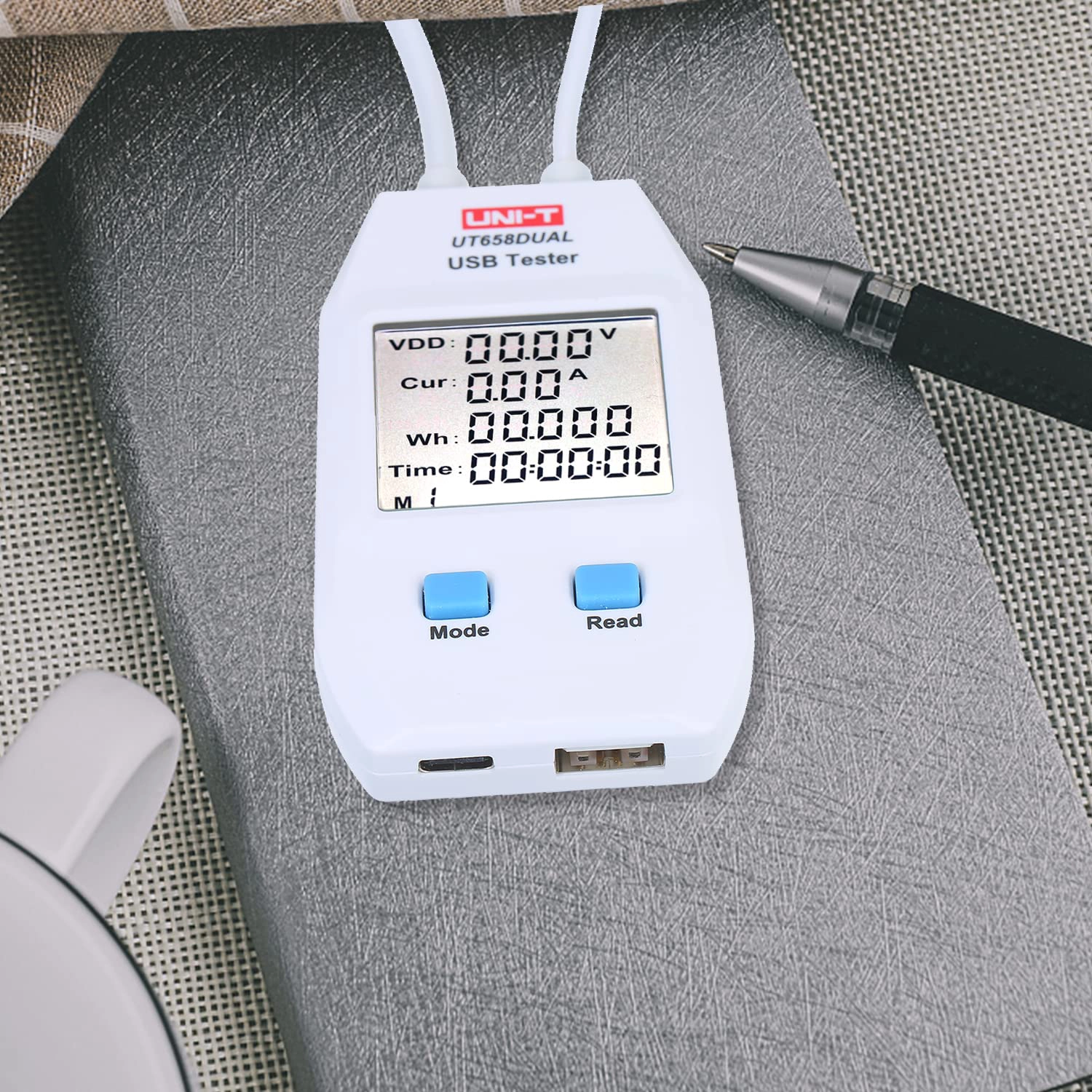 تستر USB یونی تی | UNI-T مدل UT658DUAL یک ابزار دیجیتال پیشرفته برای تست ولتاژ، جریان، ظرفیت و عملکرد شارژرها و کابلهای USB است. این تستر دارای نمایشگر LCD و قابلیت نظارت دقیق و لحظهای بر پارامترهای الکتریکی میباشد.