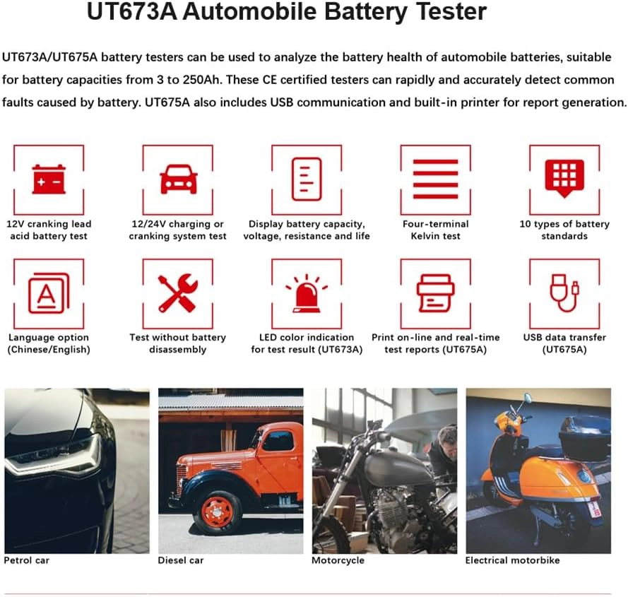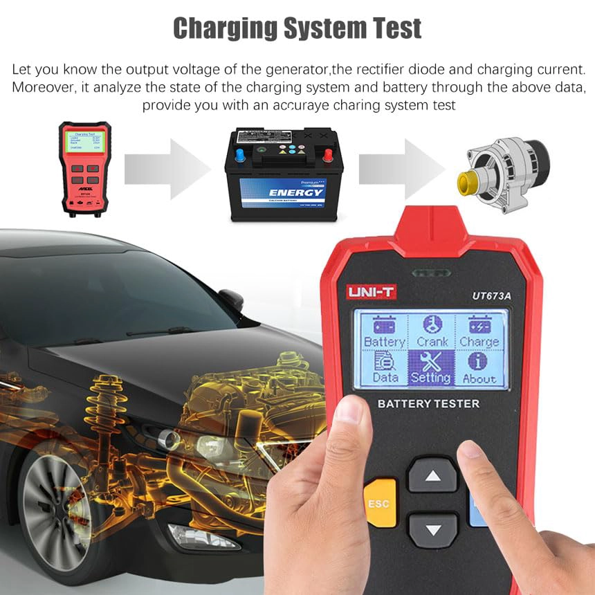 تستر باتری یونی تی | UNI-T مدل UT673A یک ابزار دیجیتال و دقیق برای تست سلامت باتری خودروهای 12 و 24 ولتی و بررسی عملکرد سیستم شارژ خودرو است. این دستگاه با طراحی مقاوم، نمایشگر دیجیتال و رابط کاربری آسان، گزینهای کاربردی برای تعمیرکاران و کاربران حرفهای به شمار میرود.