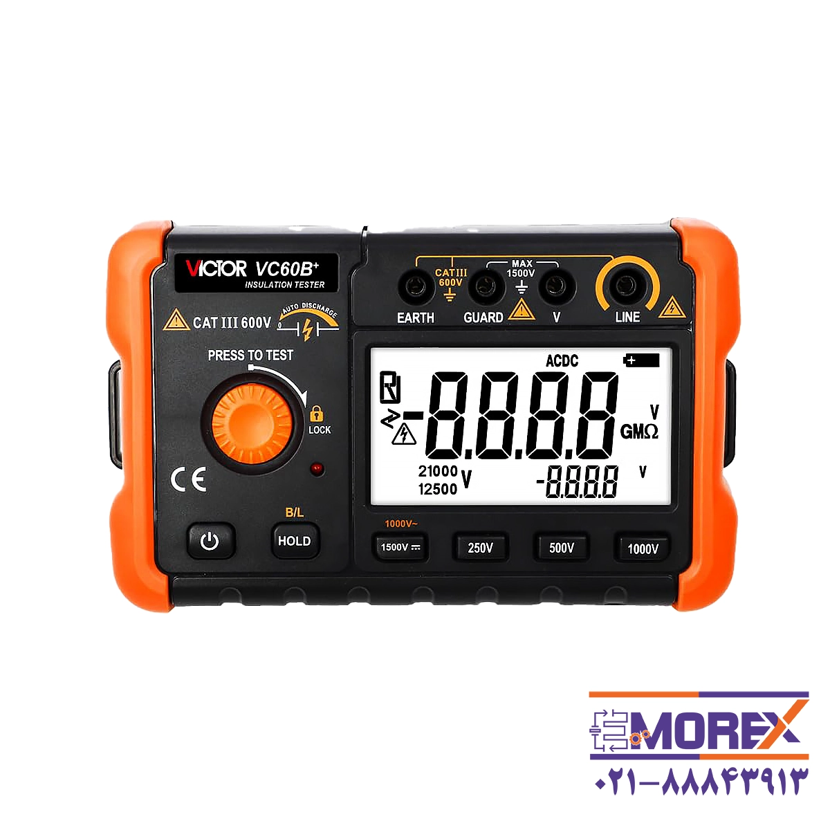 میگر (تستر مقاومت عایق) ویکتور | VICTOR مدل +VC60B یکی از ابزارهای دقیق اندازهگیری در حوزه برق و ابزار دقیق است که برای سنجش کیفیت و سلامت عایق در کابلها، موتورها، ترانسفورماتورها و تجهیزات صنعتی استفاده میشود. این دستگاه سه سطح ولتاژ تست 250، 500 و 1000 ولت DC را ارائه میدهد و قادر است مقاومت عایق را تا مقدار 4.99 گیگااهم با دقت ±(4٪ خوانده شده + 2 رقم) اندازهگیری کند.