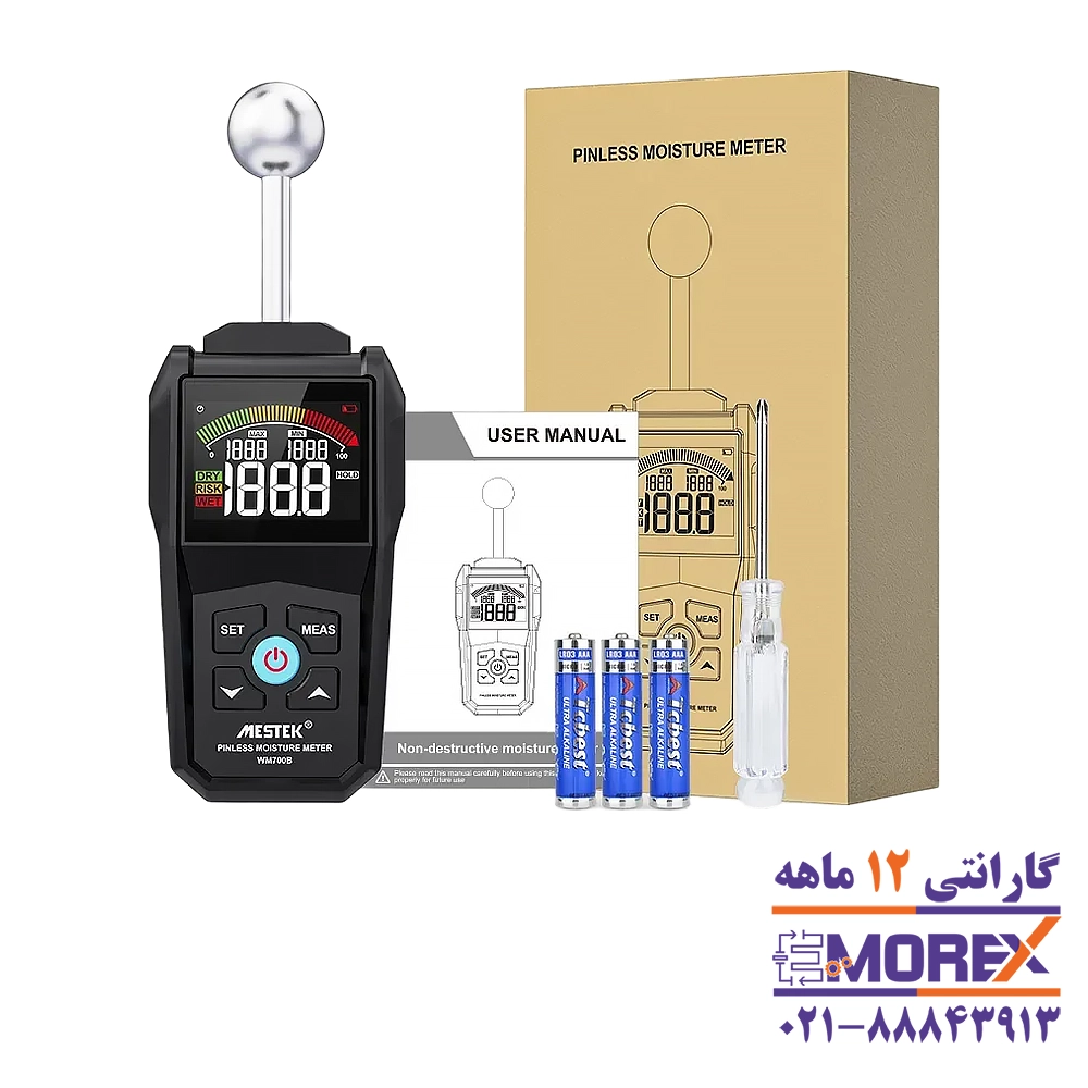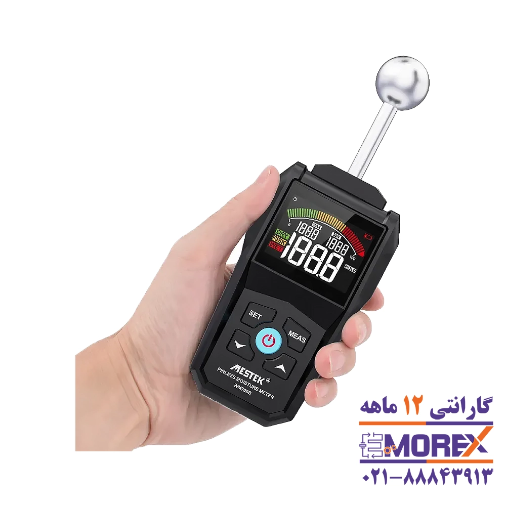 رطوبت سنج دیجیتال مستک | MESTEK مدل WM700B با فناوری اندازهگیری غیرمخرب، قابلیت نفوذ تا 40 میلیمتر در انواع سطوح را دارد. این دستگاه با صفحه نمایش LCD رنگی، هشدار رطوبت و عملکرد MAX/MIN ابزاری دقیق برای کنترل نشتی و رطوبت محیط است.