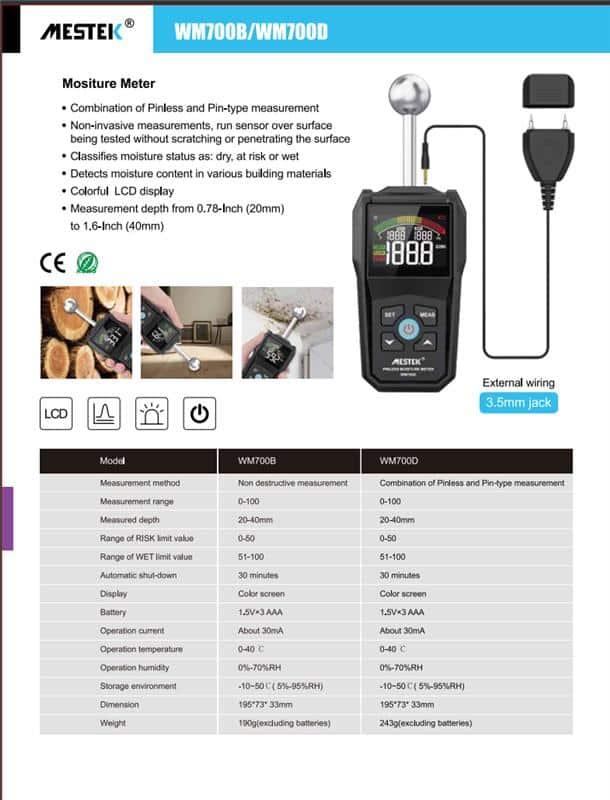 ویژگی‌های رطوبت سنج دیجیتال مستک مدل WM700B: