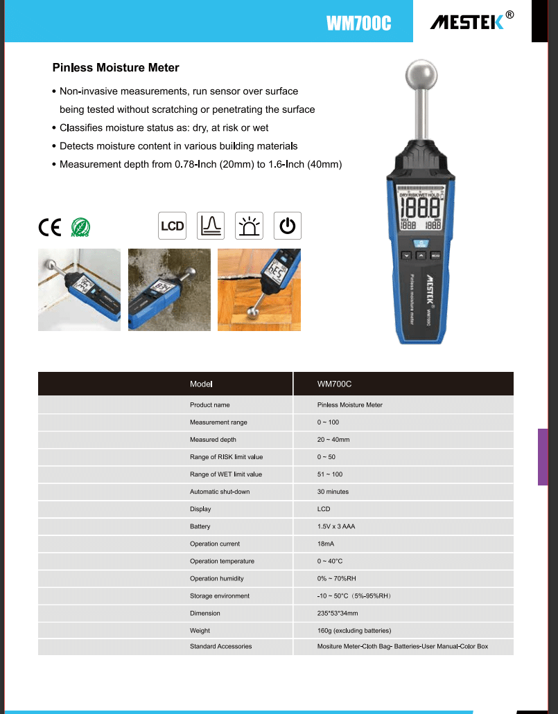 رطوبت سنج مستک مدل WM700C معمولاً دارای دقت بالا، صفحه نمایش دیجیتال و قابلیت‌های اضافی مانند ذخیره‌سازی داده‌ها و نمایش دما می‌باشد. به طور کلی، این دستگاه به کاربران کمک می‌کند تا به راحتی رطوبت را اندازه‌گیری کنند و اطلاعات لازم برای تصمیم‌گیری‌های بهتر را فراهم نمایند.