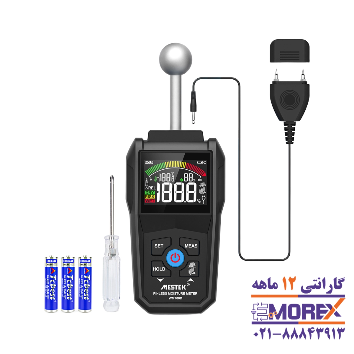 رطوبت سنج دیجیتال مستک | MESTEK مدل WM700D، دستگاهی دوکاره با قابلیت اندازهگیری رطوبت به دو روش غیرتماسی و با پین است. این ابزار برای کار روی انواع متریال مانند چوب، دیوار، بتن و گچ طراحی شده و دارای نمایشگر رنگی، کالیبراسیون خودکار و بدنه قابلحمل است.