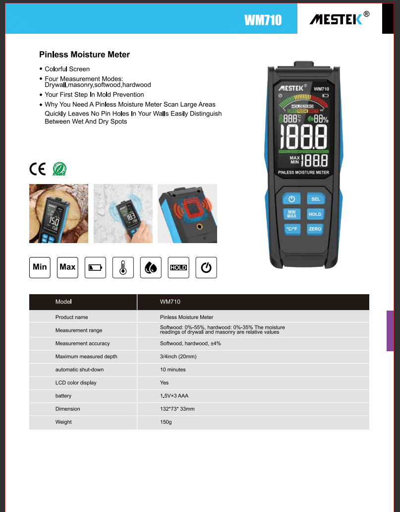 رطوبت سنج چوب و دیوار مستک | MESTEK مدل WM710 یک دستگاه دقیق با عملکرد غیرمخرب است که با سنسور القایی و صفحه نمایش رنگی 3 اینچی، رطوبت چوب و انواع مصالح ساختمانی را به‌صورت دقیق و سریع اندازه‌گیری می‌کند. طراحی ارگونومیک و کاربرپسند، آن را به ابزاری مناسب برای استفاده در منزل، محل کار و پروژه‌های ساختمانی تبدیل کرده است.